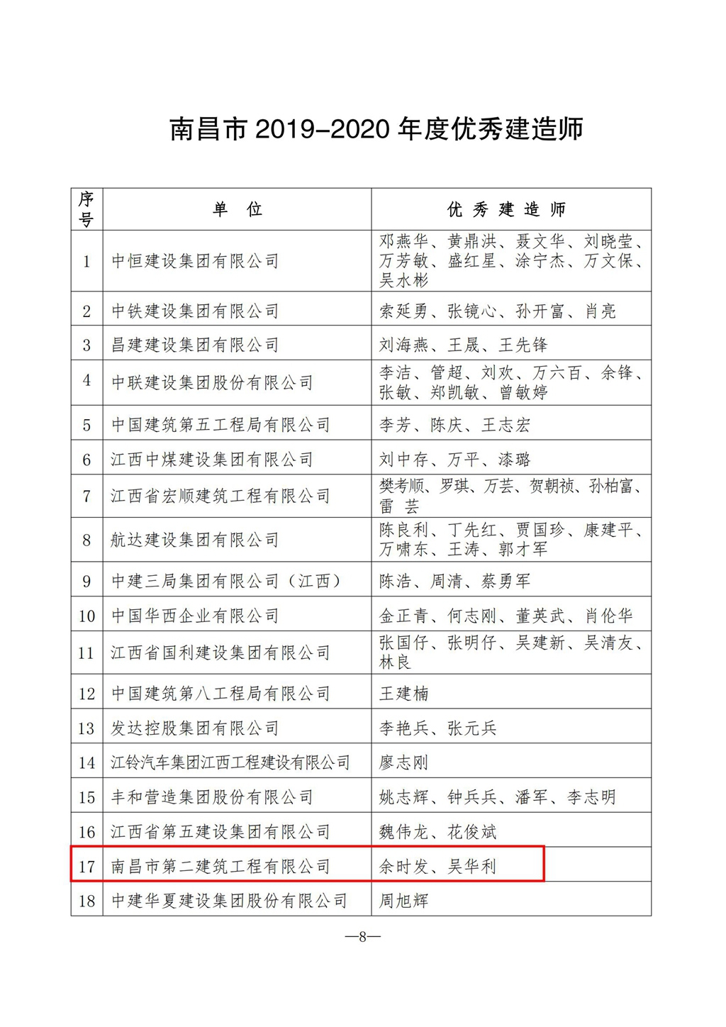 為表彰先進、樹立典型,鼓勵建筑業(yè)做大做強,著力推動我市建筑業(yè)快速健康發(fā)展,南昌市建筑業(yè)協(xié)會開展全市 2019—2020 年度南昌市建筑業(yè)先進企業(yè)和優(yōu)秀建造師(監(jiān)理師)評選活動。經(jīng)企業(yè)申報、市建協(xié)評審、綜合市建設(shè)局相關(guān)職能部門意見,共有 82 個單位被評為南昌市建筑業(yè)先進企業(yè) ,151 名建造師被評為南昌市建筑業(yè)優(yōu)秀建造師,其中,我公司再次獲評市“先進企業(yè)”、余時發(fā)和吳華利被評為市“優(yōu)秀建造師”稱號,并受到表彰。