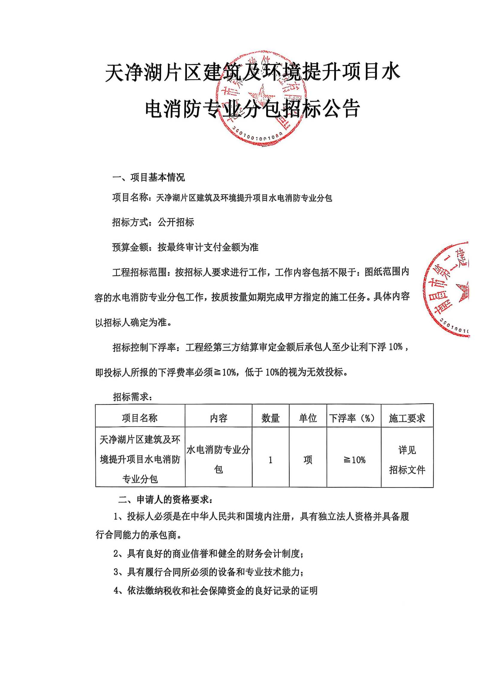 天凈湖片區(qū)建筑及環(huán)境提升項(xiàng)目水電消防專業(yè)分包招標(biāo)公告