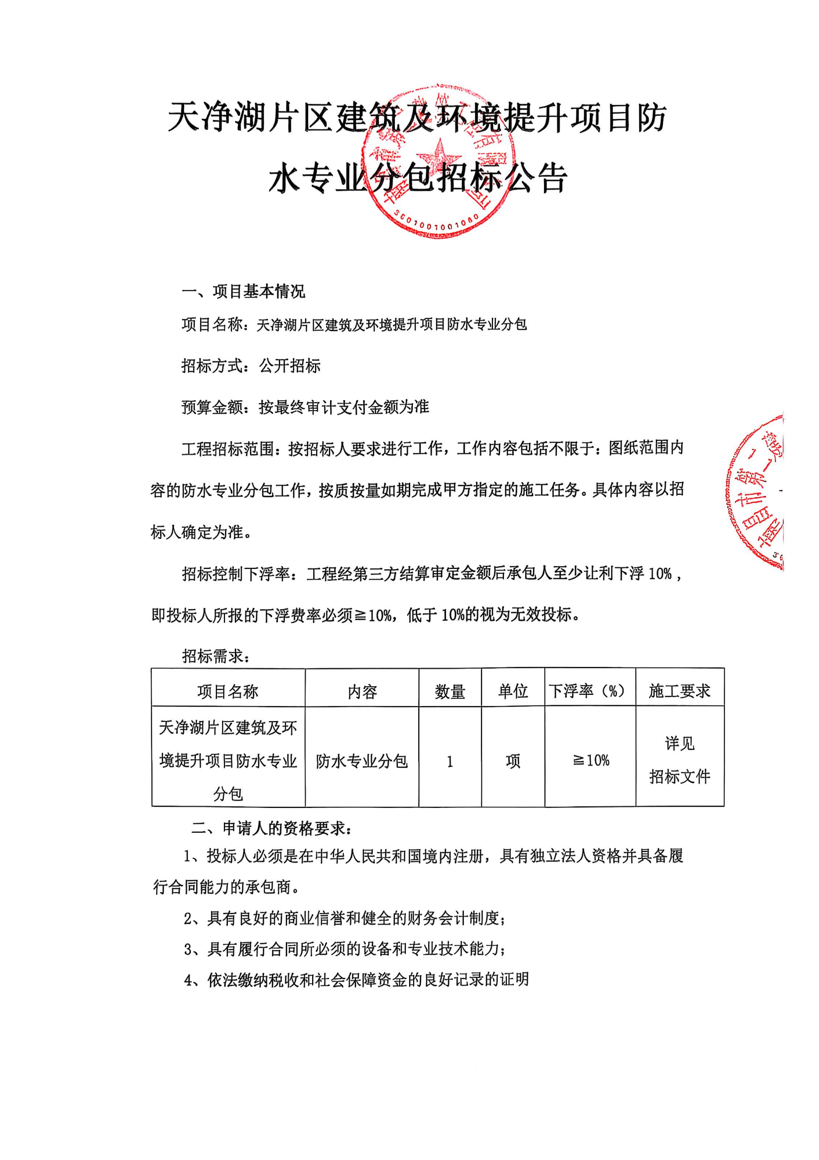 天凈湖片區(qū)建筑及環(huán)境提升項(xiàng)目防水專業(yè)分包招標(biāo)公告