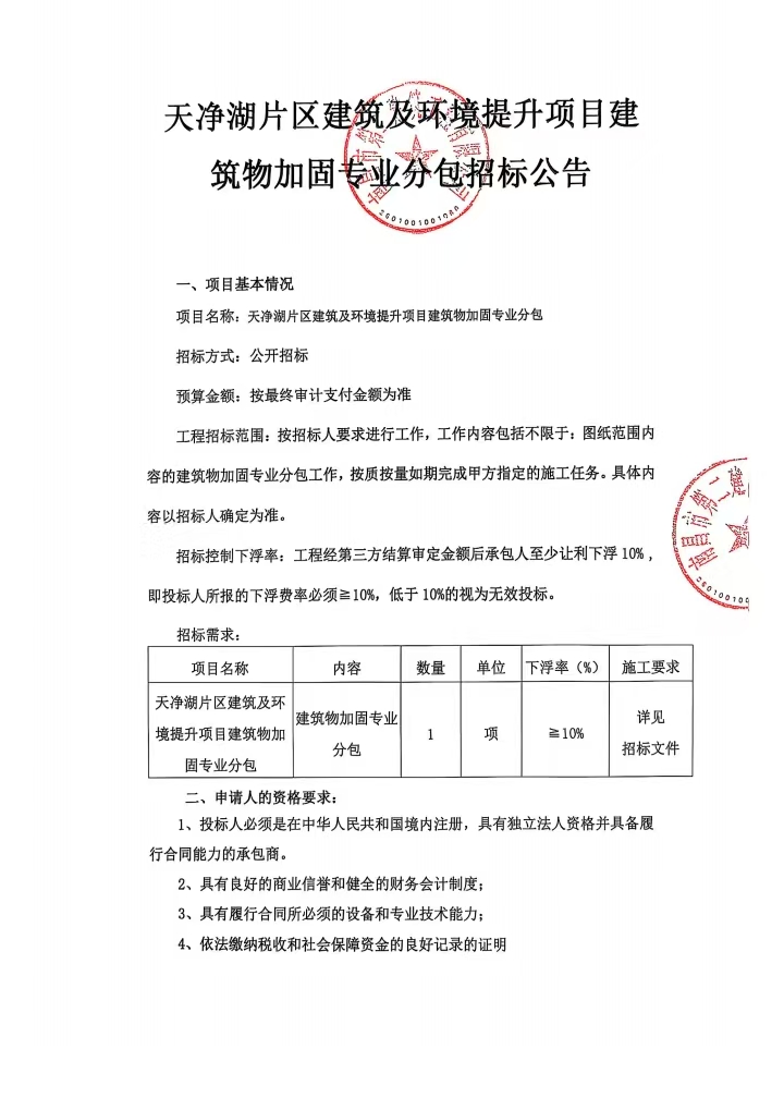 天凈湖片區(qū)建筑及環(huán)境提升項目建筑物加固專業(yè)分包招標公告